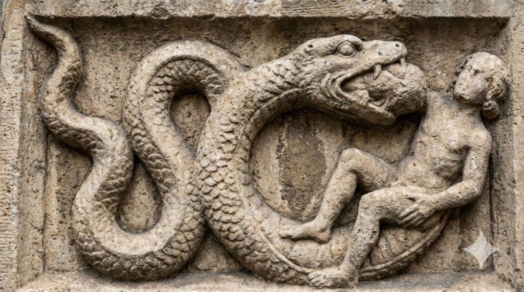 そして、最も衝撃的なのがエンブレムの右半分。巨大な蛇が人を口にくわえている、あの図案です。これは「ビショーネ(Biscione)」と呼ばれる大蛇で、中世ミラノを支配した名門貴族、ヴィスコンティ家の紋章に由来しています。では、なぜ人を飲み込んでいるのでしょうか?これにはいくつかの説があります。