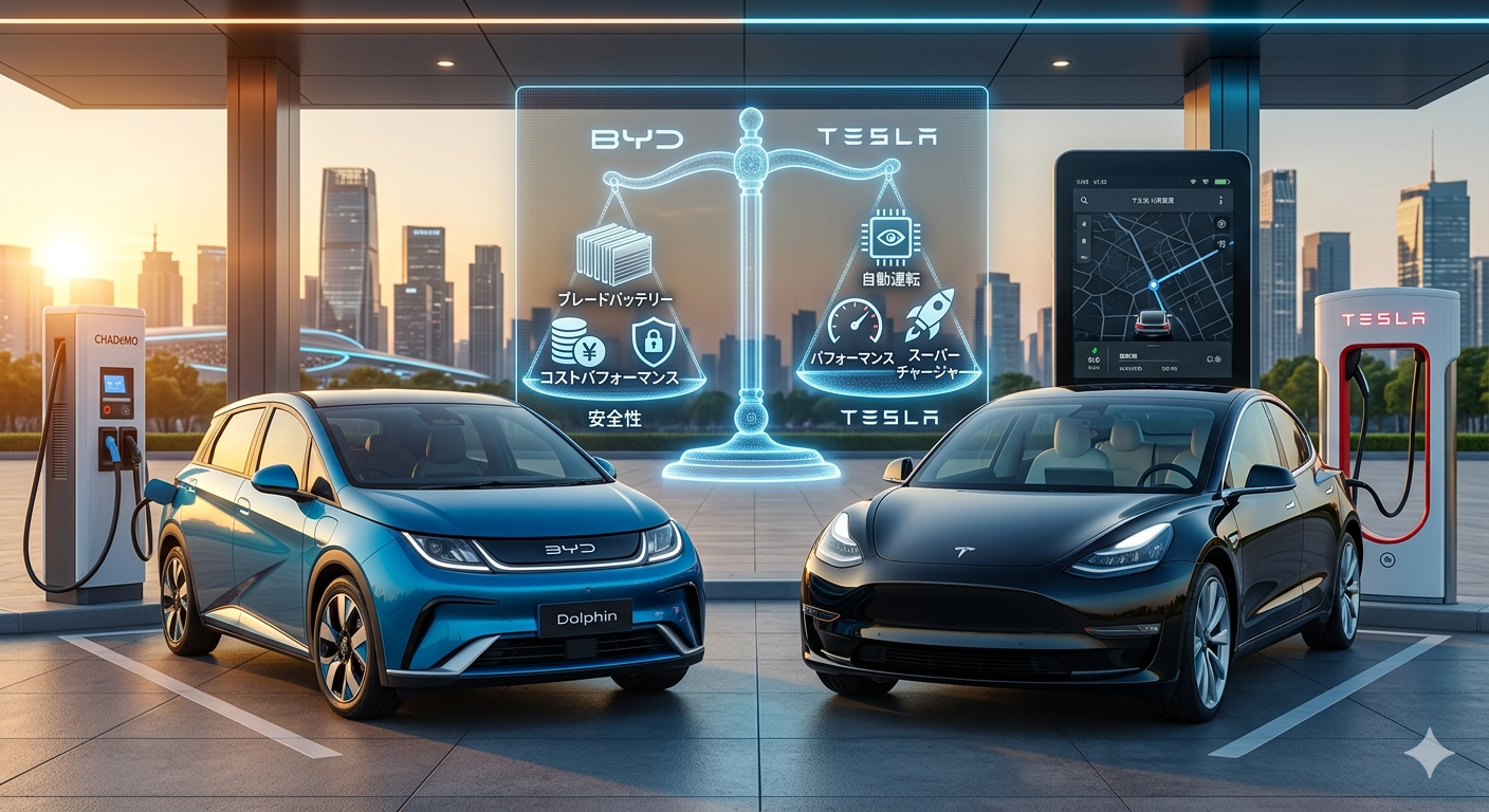 EV市場を牽引するBYDとテスラを徹底比較!価格、スペック、自動運転、充電、デザインまで、両社の違いを分かりやすく解説します。あなたにぴったりのEVがどちらか見つかります。